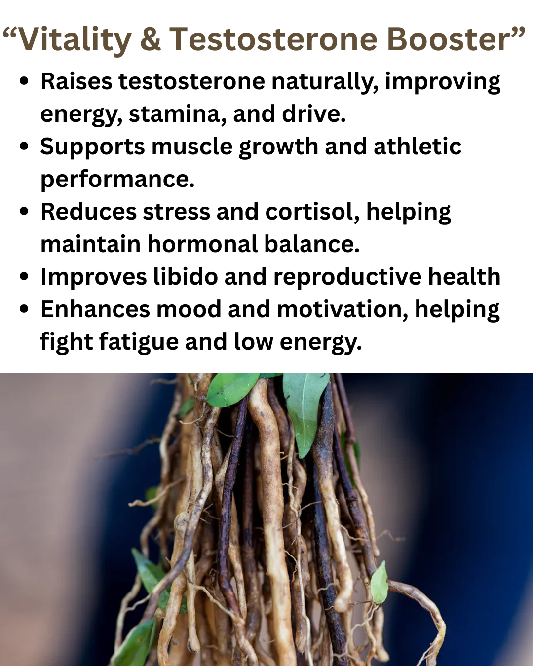 Traditionally, the root is used, particularly for men, to increase physical strength, fight ageing, aid recovery from physical work and exercise, as an adaptogen for stress and as an aphrodisiac; it is renowned for its ability to naturally optimise testosterone levels, improve endurance, and promote well-being (Rehman & Choe, 2016).
